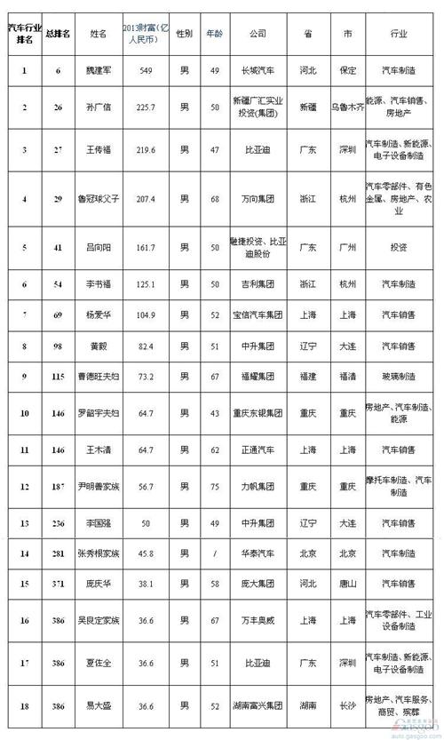 福布斯中國(guó)富豪榜汽車業(yè)入選人一覽