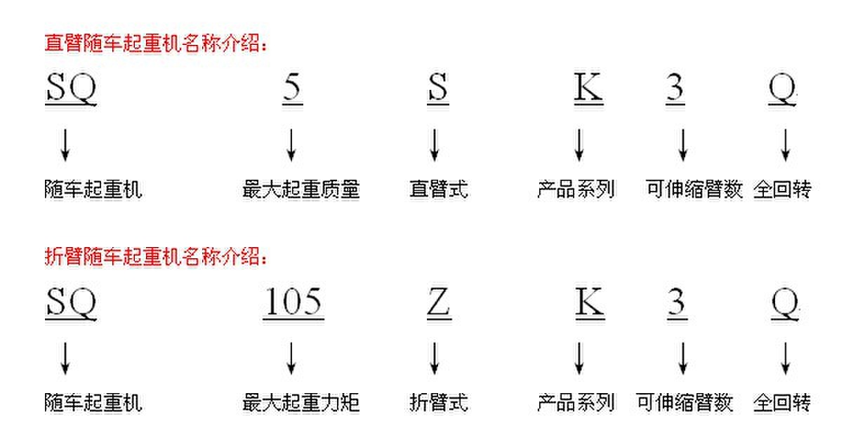 徐工隨車吊的代碼由6個(gè)部分組成。又分為折臂吊和直臂吊。常見的命名方式為SQ105ZK3Q或者SQ5SK3Q這種。那么這中代碼中每個(gè)位置分別代表什么意思呢?請看下表。