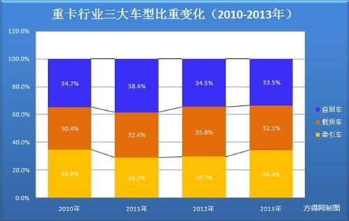 隨著牽引銷量增長(zhǎng)帶來(lái)的比重?cái)U(kuò)大,重卡行業(yè)的比重結(jié)構(gòu)也發(fā)生一定變化。在2013年,牽引車在重卡市場(chǎng)的比重增長(zhǎng)了4.7%,從2012年的29.7%增加到34.4%,使其市場(chǎng)份額從最末位上移至首位,一改2011年、2012年連續(xù)兩年占比最小的弱勢(shì)。而自卸車市場(chǎng)份額下降1%(從34.5%到33.5%),載貨車市場(chǎng)份額則下降了3.7%(從35.8%到32.2%)。這從側(cè)面也說(shuō)明甩掛運(yùn)輸?shù)玫竭M(jìn)一步推廣,牽引車取代了部分載貨車市場(chǎng)需求。