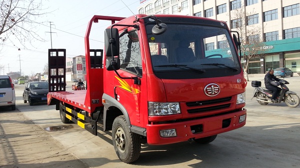 平板運(yùn)輸車是專門用來拉挖掘機(jī)鉤機(jī)叉車等大型機(jī)械設(shè)備和工程機(jī)械的專用汽車。區(qū)別于一般的貨車載貨載重分布均勻的特點(diǎn),拿平板運(yùn)輸車最常見的用途拉挖掘機(jī)來說,挖掘機(jī)上下時(shí)必須要爬梯才能方便上下。挖掘機(jī)上下的時(shí)候?qū)ε捞莺驼嚨臎_擊非常大,所以必須要求爬梯的強(qiáng)度非常強(qiáng)才能經(jīng)久耐用。爬梯一般是用手動舉起和放下,所以平板運(yùn)輸車廠家湖北俊龍專用汽車有限公司的平板運(yùn)輸車產(chǎn)品都在爬梯上裝上兩根彈簧,而且對彈簧、彈簧支架的尺寸和位置通過精確計(jì)算設(shè)計(jì)制作,一個人就可以很方便的舉起和落下。平面承重部分因?yàn)橥诰驒C(jī)??康奈恢檬侵饕?fù)重區(qū),我們在承重區(qū)加強(qiáng)方筒鋼鋪放密度,確保經(jīng)久耐用。目前是平板運(yùn)輸車銷售的旺季,也正時(shí)值柴油車尾氣排放國三和國四切換的時(shí)候,很多平板運(yùn)輸車用戶苦于沒有合適的國四平板運(yùn)輸車產(chǎn)品,下面平板運(yùn)輸車廠家湖北俊龍專用汽車有限公司為您推薦一款一汽解放出品底盤的平板運(yùn)輸車產(chǎn)品,具體參數(shù)如下: