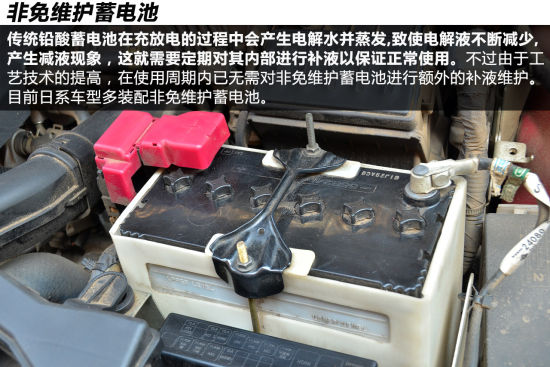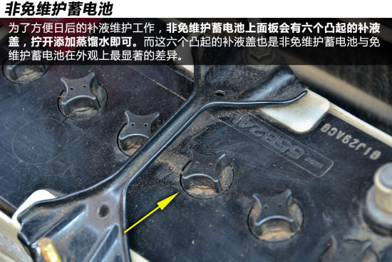 也就是傳統(tǒng)的鉛酸蓄電池,其成本相對(duì)較低,而由于其在日常使用過程中會(huì)發(fā)生減液(電解液)現(xiàn)象,因此還需要定期向其內(nèi)部添加補(bǔ)充液(蒸餾水)以保證日常使用。為了方便添加蒸餾水,非免維護(hù)蓄電池上部會(huì)有六個(gè)凸起的補(bǔ)液蓋,而這也是非免維護(hù)蓄電池與免維護(hù)蓄電池在外觀上最為明顯的差別。不過由于現(xiàn)代制造工藝技術(shù)的提高,非免維護(hù)蓄電池在其使用周期內(nèi),一般已無需進(jìn)行額外的維護(hù)(添加蒸餾水),而且其壽命也已與免維護(hù)蓄電池?zé)o異。目前,日系品牌比較普遍的裝配有非免維護(hù)蓄電池。