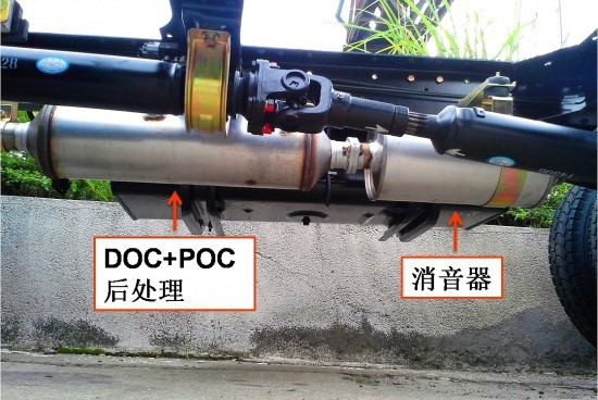 著重說一下尾處理。DOC+POC后處理可以減少尾氣中的氮氧化合物(NOX)含量,并吸收大部分顆粒物,在排氣前對尾氣進行最后一次凈化。DOC(柴油機氧化催化轉(zhuǎn)換器)促使尾氣中的CO(一氧化碳)、HC+NOx(碳氫化合物和氮氧化物)氧化,形成二氧化碳、NO2和水。而POC(顆粒氧化催化轉(zhuǎn)換器)可以捕捉尾氣中的顆粒物,也就是PM——我們常說的某地PM2.5爆表、霧霾嚴重罪魁禍首就是它。