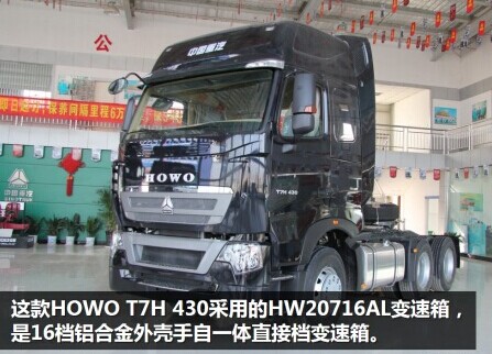 這款HOWO T7H 430采用重汽(HW)變速箱,額定輸入2000N·m(20),重型車系列(7),16個(gè)前進(jìn)檔(16),AMT手自一體(A),鋁合金外殼(L)。