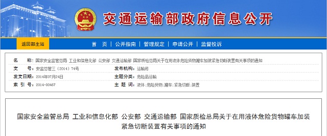 名 稱: 國家安全監(jiān)管總局 工業(yè)和信息化部 公安部 交通運(yùn)輸部 國家質(zhì)檢總局關(guān)于在用液體危險(xiǎn)貨物罐車加裝緊急切斷裝置有關(guān)事項(xiàng)的通知 | |