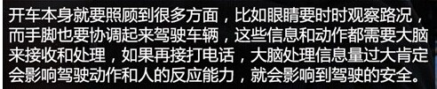 據(jù)統(tǒng)計部門稱,目前有7成左右的交通事故皆因某一方駕駛員分神而導(dǎo)致。在開車時使用手機(jī)的司機(jī)剎車反應(yīng)速度要慢19%,尤其是當(dāng)司機(jī)騰出手撥打手機(jī)或者視線偏離正前方時,難以掌控方向盤以應(yīng)對轉(zhuǎn)彎或者路線變化,極易引發(fā)交通事故。此前新交規(guī)也明確:司機(jī)駕駛機(jī)動車有撥打、接聽手持電話等妨礙安全駕駛的行為,一次記2分,處20元以上200元以下罰款。