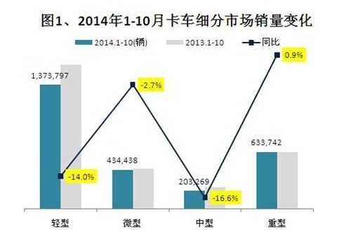 據(jù)整理的數(shù)據(jù),2014年1-10月,我國卡車市場(包括完整、非完整車輛以及半掛牽引車,下同)銷量同比下跌,銷量累計實現(xiàn)264.52萬輛,同比下滑9.3%。這主要與國四排放標(biāo)準(zhǔn)在國內(nèi)推進,以及房地產(chǎn)投資增速持續(xù)回落等因素有關(guān)。