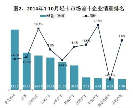 2014年1-10月,輕卡市場前十企業(yè)依次是北汽福田、江淮、江鈴汽車、東風(fēng)汽車、金杯汽車、長城汽車、慶鈴汽車、長安汽車、南京依維柯和力帆汽車。