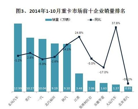 2014年1-10月,輕卡市場前十企業(yè)依次是東風(fēng)汽車、重汽、一汽、北汽福田、陜汽、江淮、依維柯紅巖、安徽華菱、大運汽車和北奔重汽。