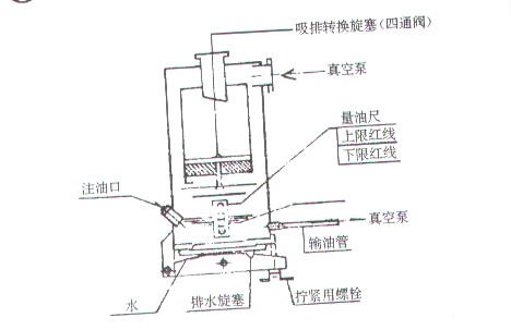 分離的機油重新作業(yè)真空泵潤滑油使用,但分離出的水會貯留在箱底,如油色彎白,會降低潤滑性和氣密性。因此應(yīng)定期清掃內(nèi)部、更換機油、油量在真空度約96千帕時補充到量油尺下中間刻線,使用HT-40#機械油,每月清掃一次內(nèi)部。