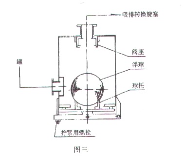 它是萬一當罐內(nèi)滿量自動停吸裝置發(fā)生故障時,為防止污水進入泵內(nèi)面自動工作的裝置,雙重保護。吸入油分較多的污泥,則易侵蝕球座和球,故要定期更換。另外,作業(yè)時容易積存污水,所以作業(yè)結(jié)束后一定要排水和清掃浮球,并定期更換浮球。(見圖三)