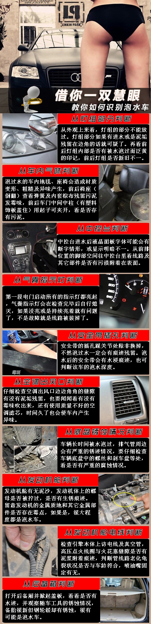 最近這些年氣候惡化,經(jīng)常出現(xiàn)“水浸街”的現(xiàn)象。每年各地都會(huì)出現(xiàn)很多“泡水車”。不管是吸污車吸糞車還是灑水車?yán)嚨拳h(huán)衛(wèi)車乃至小轎車客車,泡過水自然都會(huì)對(duì)質(zhì)量有所影響。對(duì)電路,金屬防銹等部分,油路水路氣路,發(fā)動(dòng)機(jī)變速箱等密封都會(huì)有一定影響,當(dāng)然也會(huì)影響到二手吸污車等二手車的價(jià)值。那么怎么分辨“泡水車”,讓您買二手車不吃虧呢?吸污車廠家一張圖教您巧識(shí)別。