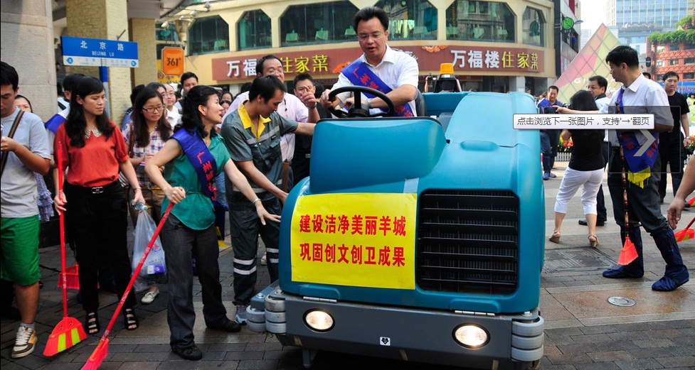 廣州市委書記駕駛電動(dòng)掃路車北京路上掃路
