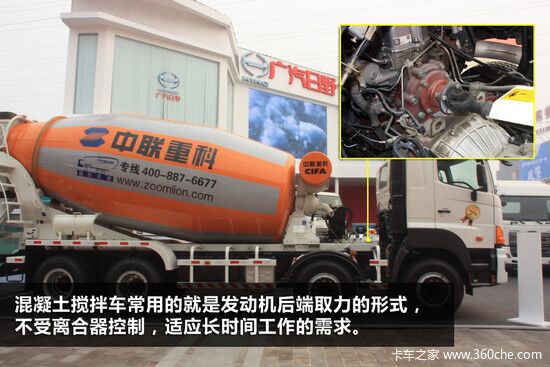 發(fā)動機后端取力(PTO1):發(fā)動機后端取力一般都是在飛輪處,它優(yōu)點是不受主離合器控制,但因改變了曲軸未端的結構,對于平衡會有一些影響。這種取力形式的應用大家比較熟悉的就是水泥攪拌機。取力器裝在離合器外殼上且在不同工況下攪拌滾筒的旋轉方向不同。在進料和運輸過程正向旋轉,出料反向旋轉,工作結束切斷與發(fā)動機動力連接。