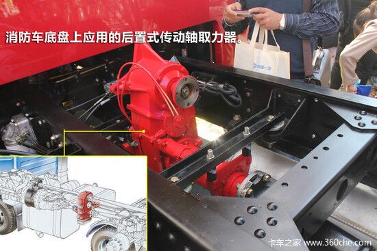 傳動軸取力是將取力器作為獨立總成,設置于傳動軸之間。它轉動的過程中具有良好的動平衡性能,工作可靠性高,結構也比較簡單。在消防車上有應用。