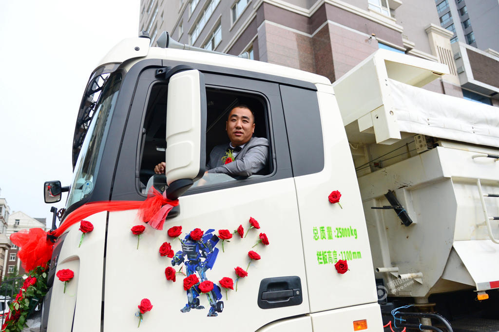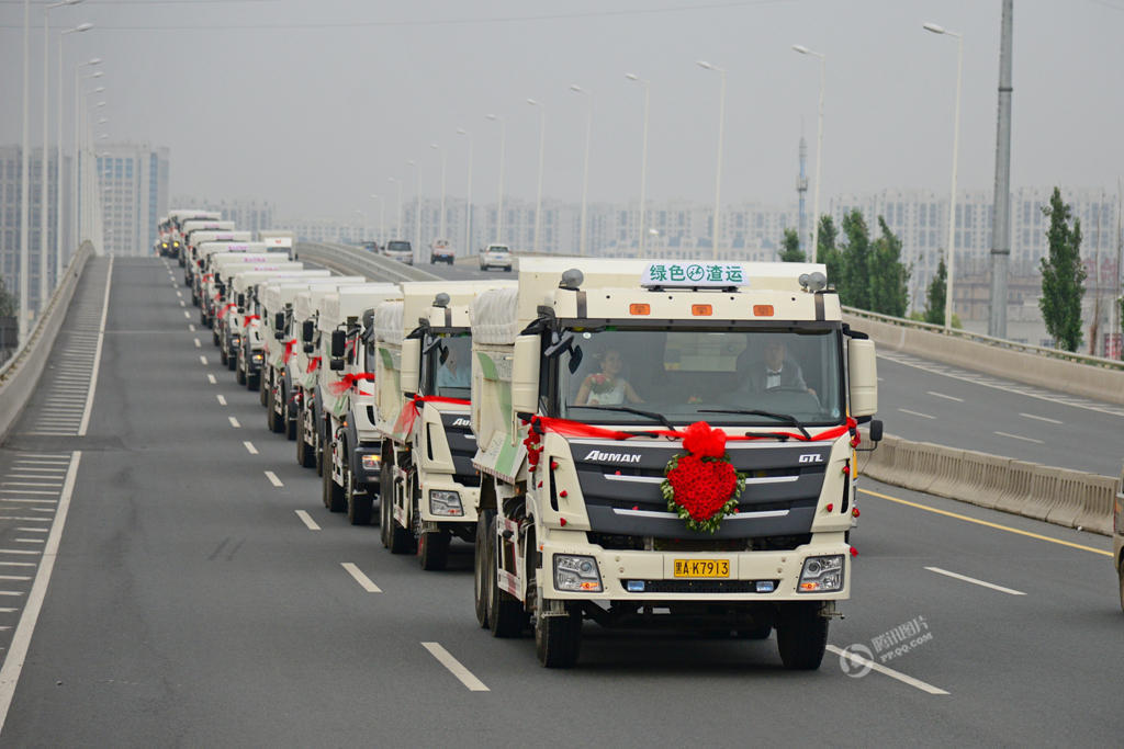 6月27日,哈爾濱市松北區(qū)新新怡園小區(qū)門前,36輛嶄新的綠色環(huán)保渣土車在路邊依次排開,每輛車車頭上都貼著大大的紅喜字,周圍扎滿了鮮花和氣球,浩浩蕩蕩的渣土車組成的接親車隊(duì)吸引了過(guò)往市民的目光。據(jù)新郎介紹,自己從事土方運(yùn)輸生意,36輛嶄新的渣土車也是新買的,因?yàn)榻裉焱瑯右彩枪鹃_業(yè)的第一天,為了雙喜臨門的好兆頭,干脆就用新買的渣土車來(lái)接新娘。說(shuō)起結(jié)婚形式的獨(dú)特,新郎表示,“與媳婦談戀愛(ài)時(shí)就一直考慮結(jié)婚的形式,為了給她一個(gè)終生難忘的婚禮,經(jīng)過(guò)深思熟慮后,就決定要用自家的渣土車作為接親的車輛。而這一切,都是悄悄為妻子準(zhǔn)備的,只為了給她一個(gè)驚喜。