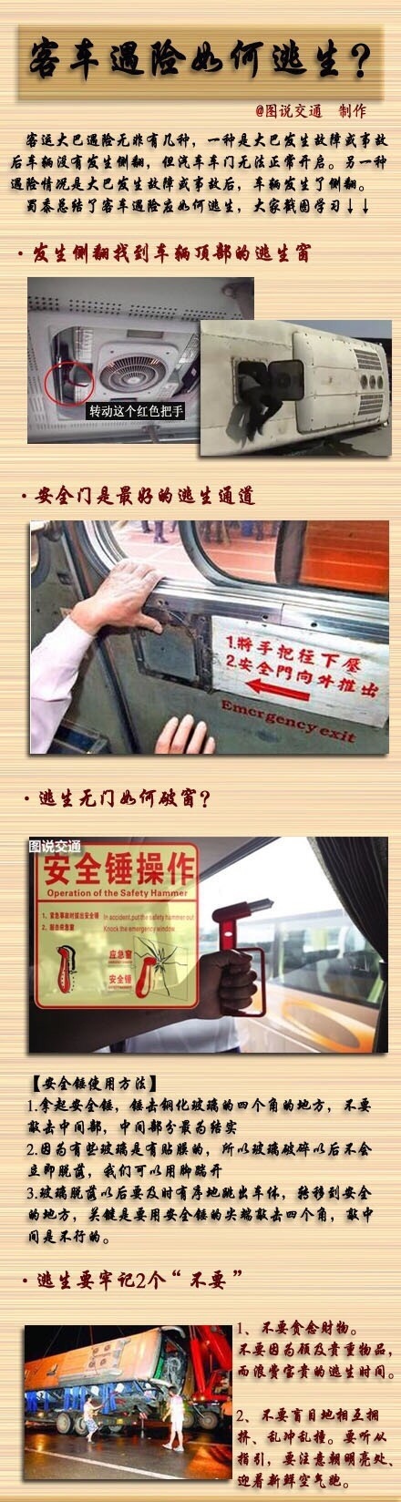 客運(yùn)大巴遇險(xiǎn)無非有幾種,一種是大巴發(fā)生故障或事故后車輛沒有發(fā)生側(cè)翻,但汽車車門無法正常開啟。另一種遇險(xiǎn)情況是大巴發(fā)生故障或事故后,車輛發(fā)生了側(cè)翻。蜀黍總結(jié)了客車遇險(xiǎn)應(yīng)如何逃生,大家戳圖詳細(xì)了解!