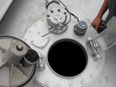 上圖是鋁合金歐標(biāo)罐口,又稱人孔蓋,安裝于油罐頂部,具有內(nèi)置呼吸和緊急排氣功能,并可在人孔蓋上安裝油氣回收閥、量油孔、防溢流探桿等,防溢流傳感系統(tǒng)在裝油的過程中,當(dāng)液面到達(dá)探測(cè)位置時(shí),傳感系統(tǒng)將自動(dòng)報(bào)警,從而停止裝油。內(nèi)置呼吸閥使油罐在運(yùn)油過程中內(nèi)部壓力保持穩(wěn)定,與外部壓力達(dá)到平衡,其傾倒防止溢流的設(shè)計(jì)使油罐車在發(fā)生意外的情況下保持密封,緊急排氣裝置在罐內(nèi)壓力急劇升高的情況下,將自動(dòng)打開,釋放罐內(nèi)壓力,從而防止事故的發(fā)生,大大提高運(yùn)油的安全性。