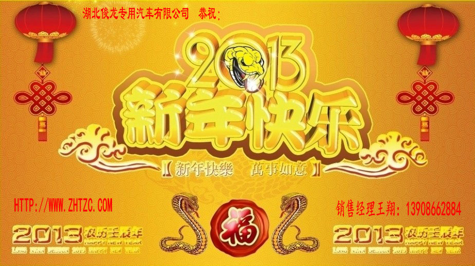 一年一度的春節(jié)到了,新的2013年是蛇年,銀蛇狂舞辭舊歲,湖北俊龍專用汽車有限公司 銷售經(jīng)理王翔在此向廣大用戶說一聲 新年好!希望大家在新的一年里,事事順心,生意興隆,財源廣進(jìn)!