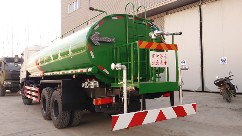 車身左右兩側及后面的剖安置的有防護欄,防護欄都是用紅白相間的顏色組合而成,形成中原一點紅的警示,而且都是用Q235A碳鋼焊接連接的而成,安全牢固。后部防護斷面尺寸為120×50×5mm,后部防護離地高度480mm,上面還設有一個灑水工作平臺,工作臺是用半人高的鐵欄圍成,上面還特別用白底紅漆設置了一個溫馨提示。