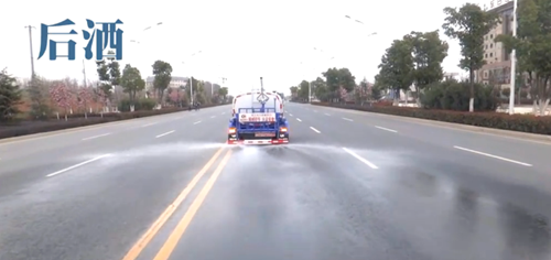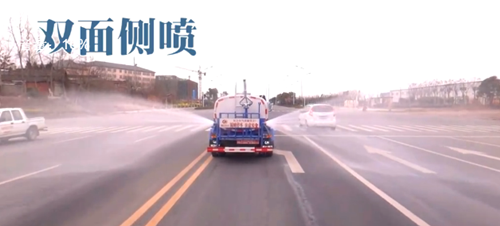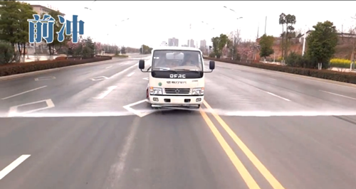 灑水車(chē)前沖(我們經(jīng)??吹綖⑺?chē)沖洗路面是從車(chē)前端下部,兩個(gè)噴頭對(duì)沖噴出高壓水柱,高壓水柱效果可以對(duì)沖三個(gè)車(chē)道左右)