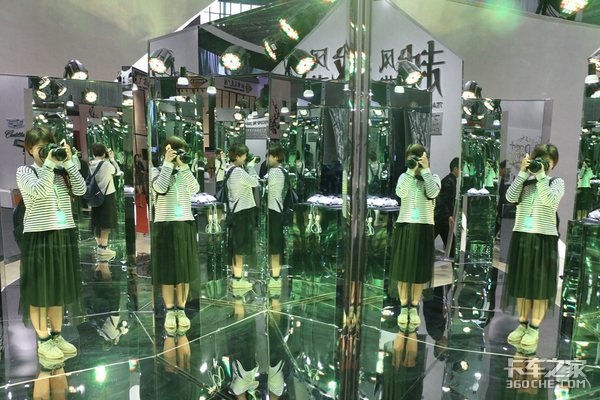 這個不用多說了,光看上面這照片就知道神奇了吧。在3號館卡車展臺的媒體區(qū),為了讓大家緊張的情緒得以放松,展內還設了一個藝術展館。這個滿是鏡子的小房間名叫《幻影》,從外面進入到這個神奇的空間,瞬間就看到無數復制的自己,然后就得扶著鏡子慢慢走,要不然可能這邊剛撞上玻璃,轉個身又撞上了。