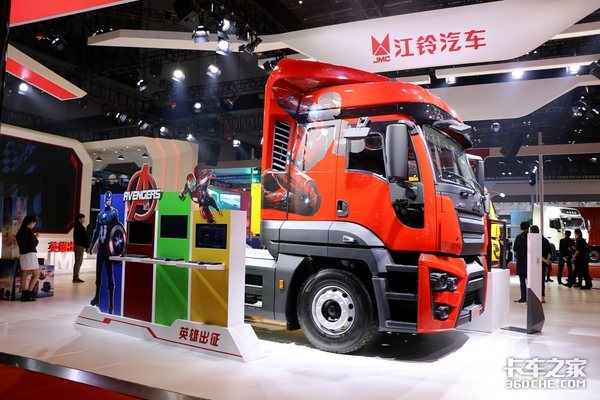 遠遠望著江鈴重卡的展臺,一下子就被這個高大的鋼鐵俠給吸引了,走近一看,連車身都印著。大概江鈴覺得鋼鐵俠的英雄形象正好符合重卡定位,所以將它作為形象代言人。一般重卡上的涂裝都是獅子、老虎等動物,這個江鈴4X2牽引車上的鋼鐵俠無疑是最有個性的。