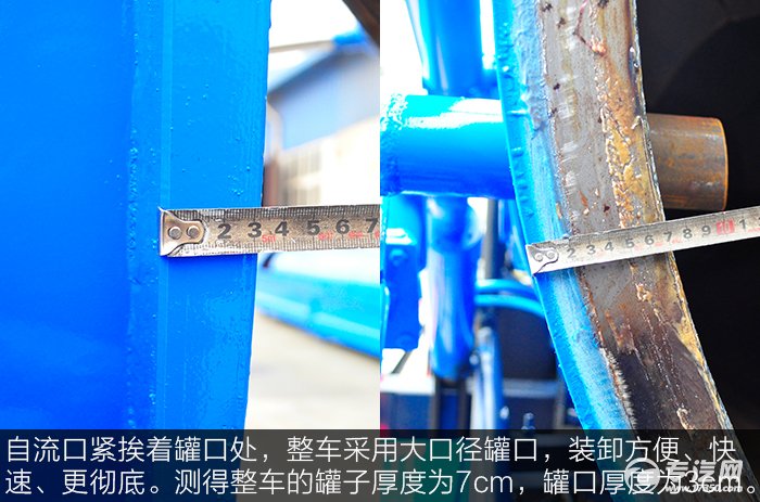 自流口緊挨著罐口處,整車采用大口徑罐口,裝卸方便、快速、更徹底。測(cè)得整車的罐子厚度為7cm,罐口厚度為3cm。
