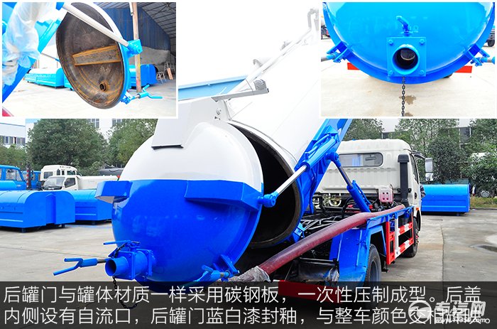 后罐門與罐體材質(zhì)一樣采用碳鋼板,一次性壓制成型。后蓋內(nèi)側(cè)設(shè)有自流口,直徑100cm的兩通球閥將內(nèi)側(cè)自流口與外側(cè)自流口連接起來。后罐門藍(lán)白漆封釉,與整車顏色交相輝映。