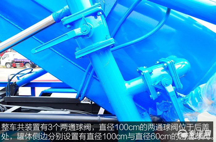 整車共裝置有3個(gè)兩通球閥,直徑100cm的兩通球閥位于后蓋處,罐體側(cè)邊分別設(shè)置有直徑100cm與直徑60cm的兩通球閥,藍(lán)漆封釉,與罐體顏色融為一體。