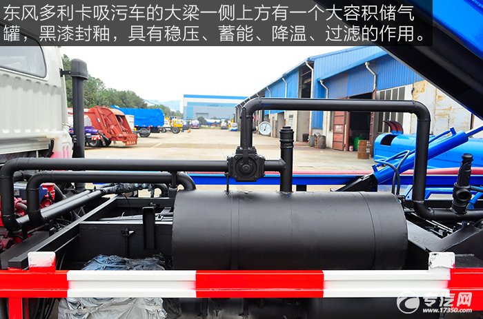 東風(fēng)多利卡國五吸污車的大梁一側(cè)上方有一個(gè)大容積儲(chǔ)氣罐,黑漆封釉,具有穩(wěn)壓、蓄能、降溫、過濾的作用。