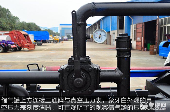 儲(chǔ)氣罐上方連接三通閥與真空壓力表,象牙白外觀的真空壓力表刻度清晰,可直觀明了的觀察儲(chǔ)氣罐的壓強(qiáng)。