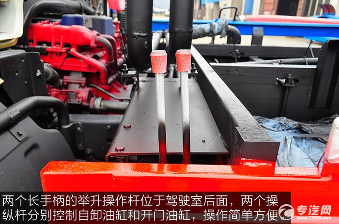 兩個(gè)長手柄的舉升操作桿位于駕駛室后面,兩個(gè)操縱桿分別控制自卸油缸和開門油缸,操作簡單方便。