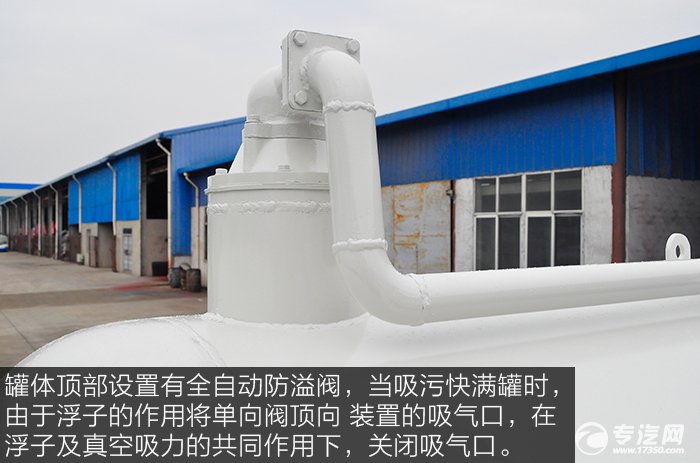 罐體頂部設(shè)置有全自動(dòng)防溢閥,當(dāng)吸污快滿罐時(shí),由于浮子的作用將單向閥頂向裝置的吸氣口,在浮子及真空吸力的共同作用下,關(guān)閉吸氣口。有效防止大罐的污水和污物吸入水循環(huán)泵管路及水循環(huán)泵。