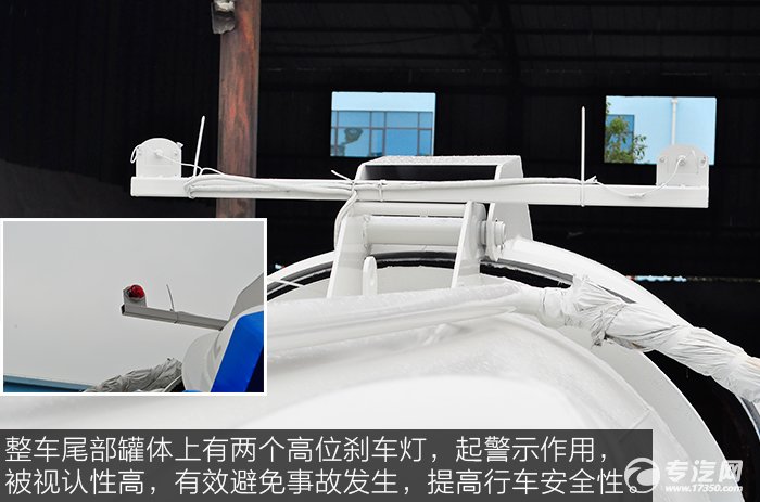整車尾部罐體上有兩個(gè)高位剎車燈,起警示作用,被視認(rèn)性高,有效避免事故發(fā)生,提高行車安全性。