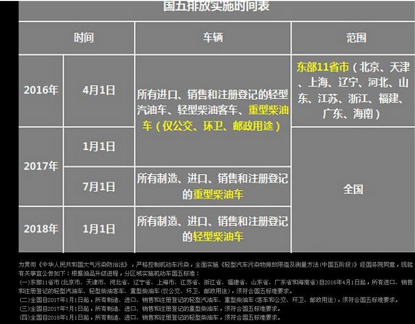 《通告》提出,自2017年7月1日起,在本市注冊(cè)登記或轉(zhuǎn)入本市的重型柴油車和輕型柴油客車執(zhí)行國(guó)Ⅴ排放標(biāo)準(zhǔn)。自2018年1月1日起,在本市注冊(cè)登記或轉(zhuǎn)入本市的除客車以外的輕型柴油車,執(zhí)行國(guó)Ⅴ排放標(biāo)準(zhǔn)。