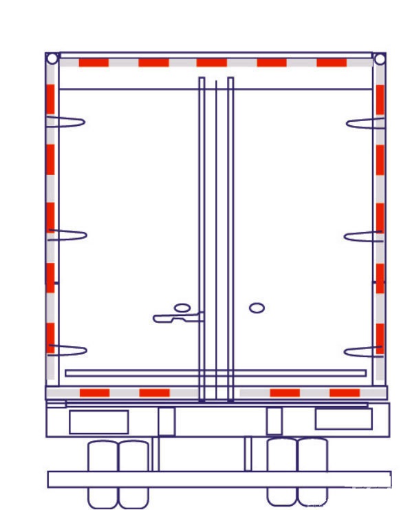 后部車身反光標(biāo)識(shí)應(yīng)盡可能體現(xiàn)車輛后部寬度和高度,水平粘貼的反光標(biāo)識(shí)體現(xiàn)的是車輛后部的寬度,兩側(cè)邊緣垂直粘貼的是體現(xiàn)車輛后部的高度,所以貨廂后部邊角相交的部分應(yīng)為白色單元,更能清楚的展示出車輛后部的輪廓。