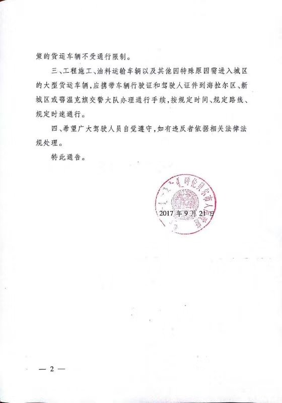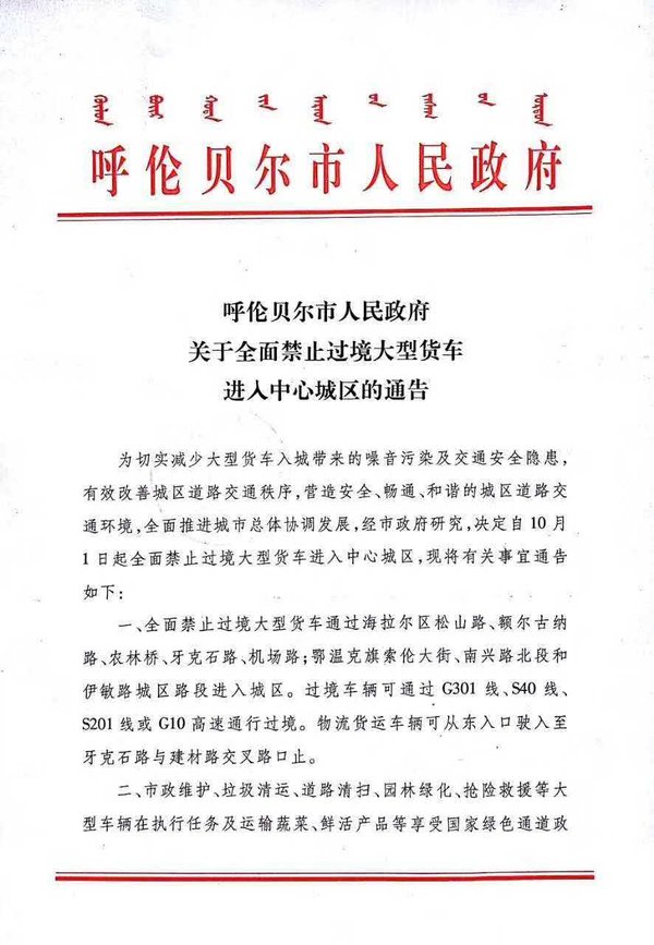近日專用汽車廠家從海拉爾客戶處獲得消息,呼倫貝爾市自10月1日起,全面禁止過境大貨車進入中心城市,詳情如下: