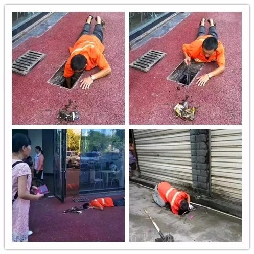 照片上的這一幕,是他正在帕緹歐香小區(qū)門口清理下水道。窨井蓋下很多垃圾,窨井又很深,他只有一根火鉗,只能整個人趴在地上,頭鉆進窨井,才能夠得著井下的垃圾。于是,他就這樣趴在地上清掏了半個多小時。撿起了磚頭、白色垃圾等雜物。