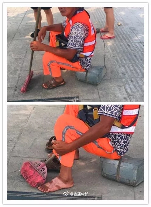 2017年7月29日,成都室外常有40度的高溫,炎熱無比!網(wǎng)友在動物園附近拍到一位環(huán)衛(wèi)工人大爺,借著工作間隙在樹蔭下休息。整個人都被曬黑,當(dāng)然脫下涼鞋后,看的更讓人心酸…