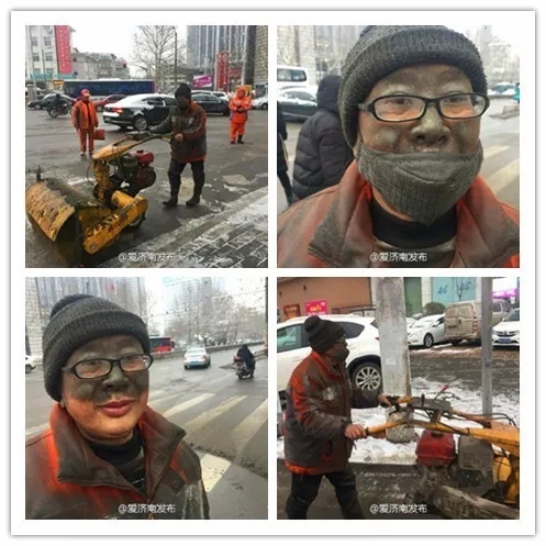 2017年2月22日,山東濟南。一位環(huán)衛(wèi)工人的臉上沾滿了機器噴出來的灰色水漬。他身上的橙色環(huán)衛(wèi)工服,也完全看不出原來的樣子。他們凌晨2點多就到街頭清理積雪,一直持續(xù)到8點,連口水都沒喝。