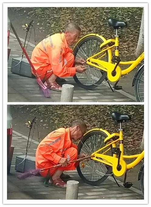 12網(wǎng)友拍到的一幕:成都街邊一環(huán)衛(wèi)大爺正在給共享單車上鏈條。