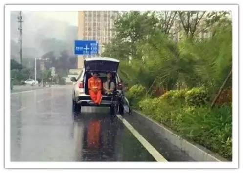 13這是路過司機拍下的一幕:廣東珠海突降暴雨,一名環(huán)衛(wèi)工無處避雨。民警張先生駕車經(jīng)過,他停下車,對環(huán)衛(wèi)工說:“快上車,我送你回去”。“不行,我還沒有掃完路,而且單車也放不進去”。于是出現(xiàn)這一幕:張先生打開后尾箱蓋,陪著他一起避雨……