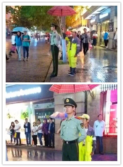 14哈爾濱中央大街上,一名武警戰(zhàn)士在路邊站崗,突然降下大雨。行人紛紛避雨或撐起雨具,這時一名環(huán)衛(wèi)工人,出現(xiàn)在了武警戰(zhàn)士的身后,伸長手臂,把雨傘打在了他的頭頂?;蛟S,戰(zhàn)士已經(jīng)在雨中站了很長時間;或許,環(huán)衛(wèi)大哥已經(jīng)勞累了一整天。