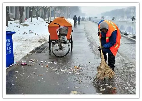 17據(jù)央視報道,我國目前環(huán)衛(wèi)工中有八成為臨時工,他們的工資不到全國城鎮(zhèn)在崗職工月平均工資的一半。2012年12月28日,河南省遂平縣建設(shè)路,78歲的張秀榮在冰天雪地里打掃衛(wèi)生。她從1976年就開始做環(huán)衛(wèi)工,已經(jīng)干了36年,一直都是臨時工身份,沒有社保和醫(yī)保。