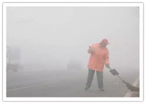 18遇到惡劣天氣,學(xué)??梢酝Un,市民可以不出門,而環(huán)衛(wèi)工則沒有辦法避開,甚至連保護措施都沒有,最多只是戴上口罩而已。2014年3月24日早晨,一名環(huán)衛(wèi)工在能見度不足百米的遼寧省大連市金州新區(qū)拓展零號路上保潔。