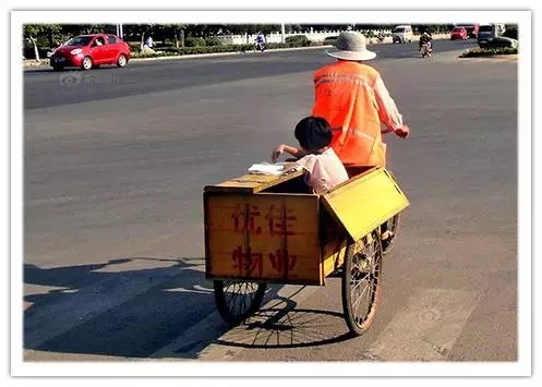2012年6月19日下午4時許,在江蘇省徐州市銅山新區(qū)北京路上,一位年邁的環(huán)衛(wèi)工人騎著環(huán)衛(wèi)車外出工作,自己的小孫女蝸盤在環(huán)衛(wèi)車里寫作業(yè)。