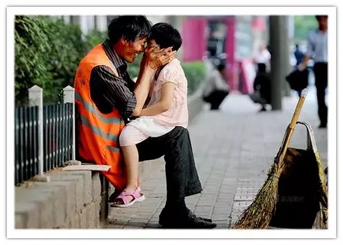 2011年5月7日,江蘇徐州煤建路,一清潔工人坐在路邊摟著自己的孫女嬉笑。當(dāng)日正值周六,小孫女不上學(xué),來到路邊尋找爺爺。女孩的父母在北京打工,小孫女從小隨著爺爺奶奶生活。這張照片曾在網(wǎng)絡(luò)上走紅,而在第二年4月,這位老人因患惡性淋巴腫瘤去世。