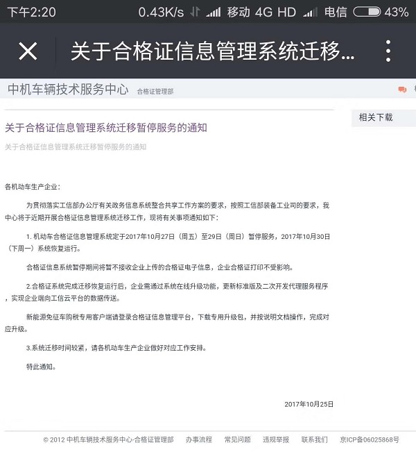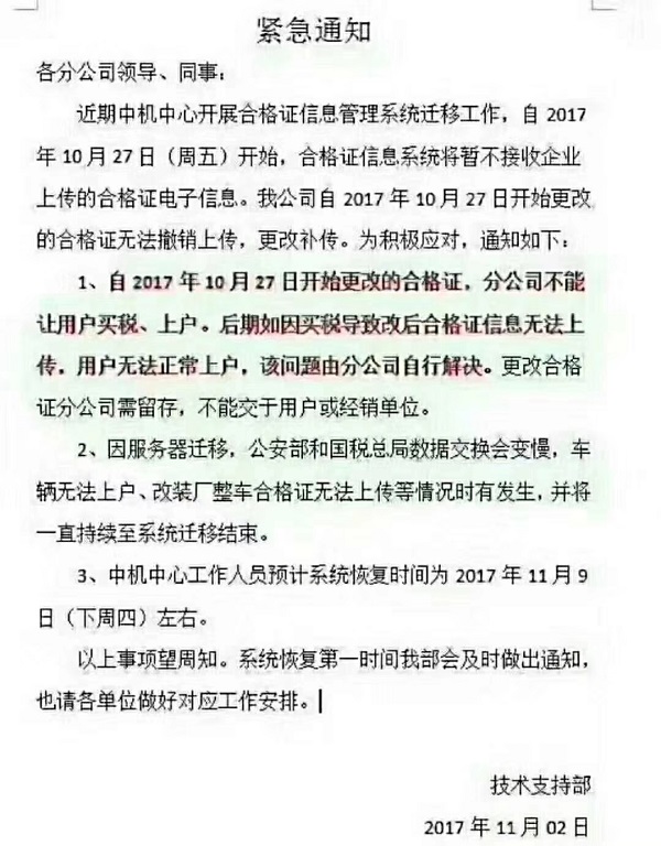 10月25日國家車輛合格證管理機(jī)構(gòu)-中機(jī)中心發(fā)布通知系統(tǒng)升級。預(yù)計(jì)在11月9日完成系統(tǒng)升級,此期間車輛無法上戶、改裝廠整車合格證無法上傳等情況會(huì)時(shí)有發(fā)生。