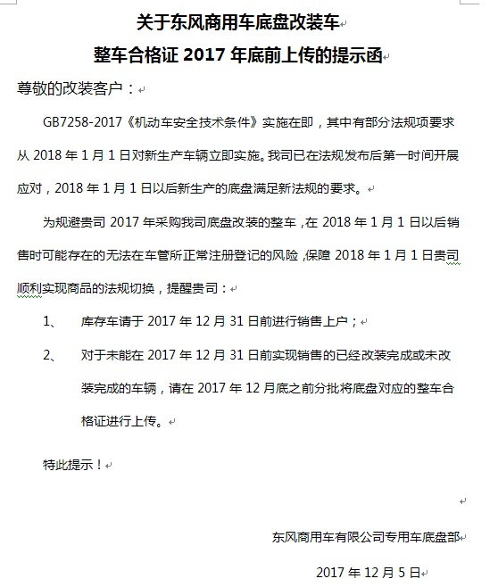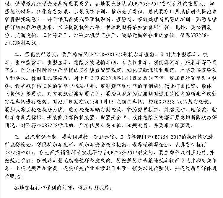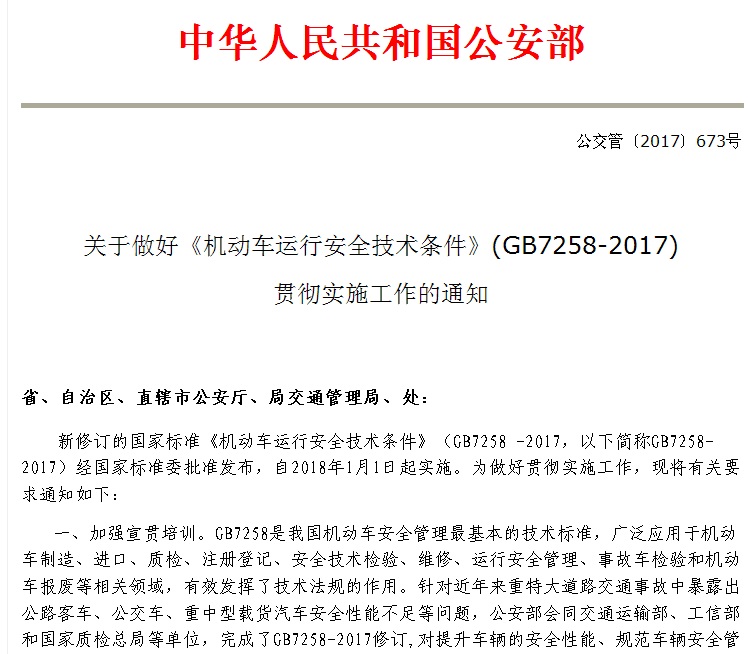 新的國(guó)標(biāo)GB7258-2017<機(jī)動(dòng)車安全技術(shù)條件>即將逐步全面實(shí)施,請(qǐng)大家注意2018.1.1這個(gè)時(shí)間點(diǎn)。不滿足GB7258新標(biāo)準(zhǔn)的產(chǎn)品,應(yīng)在2018.1.1前上傳合格證,已購(gòu)車用戶請(qǐng)盡快上牌完畢。不滿足油耗三階段只滿足二階段的應(yīng)在2018.1.1前完成營(yíng)運(yùn)證的辦理。
