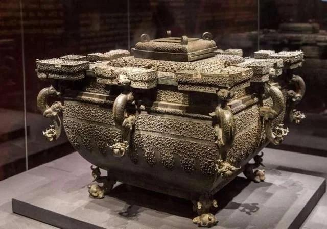 而這件文物自出土以來(lái)就受到了全世界各國(guó)的追棒,其鑄造技藝非常高超。銅尊上是用34個(gè)部件,經(jīng)過(guò)56處鑄接、焊接而連成一體,尊體上裝飾著28條蟠龍和32條蟠螭,可謂鬼斧神工。